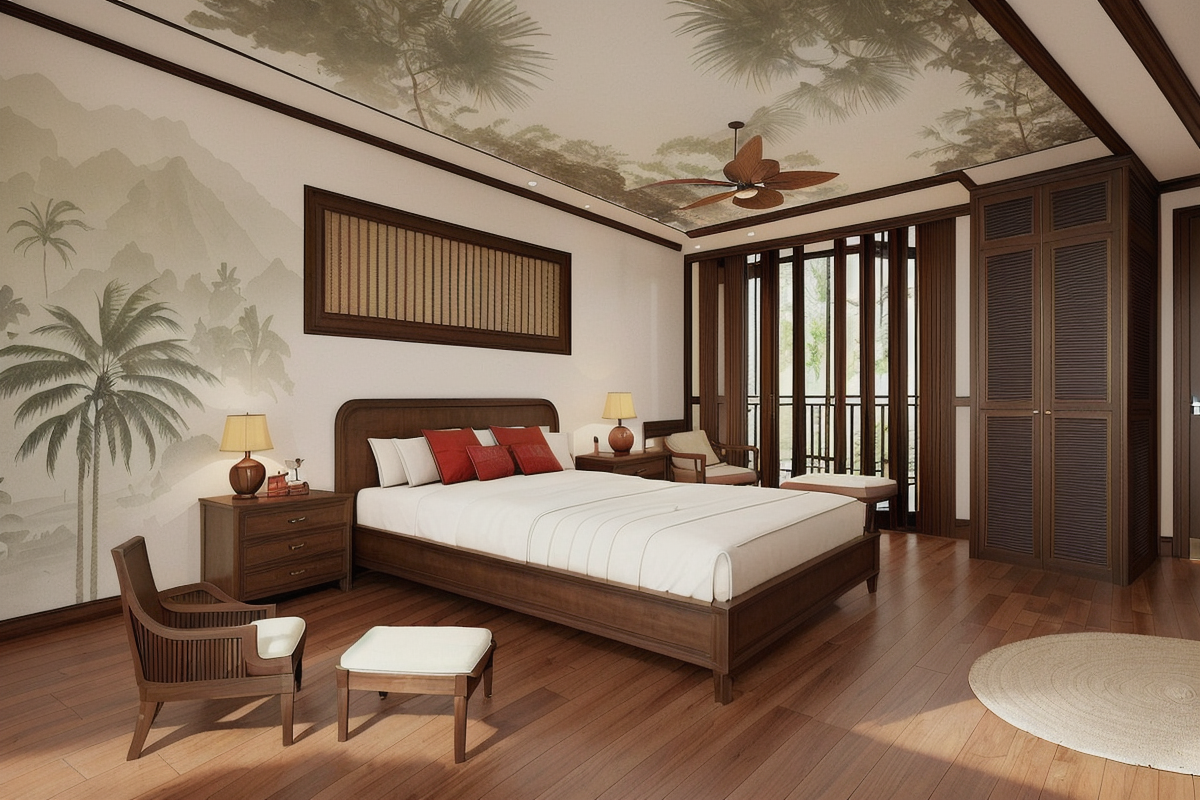indochine_bedroom, indochine bedroom, wooden floor<lora:indochine_interior:0.6>