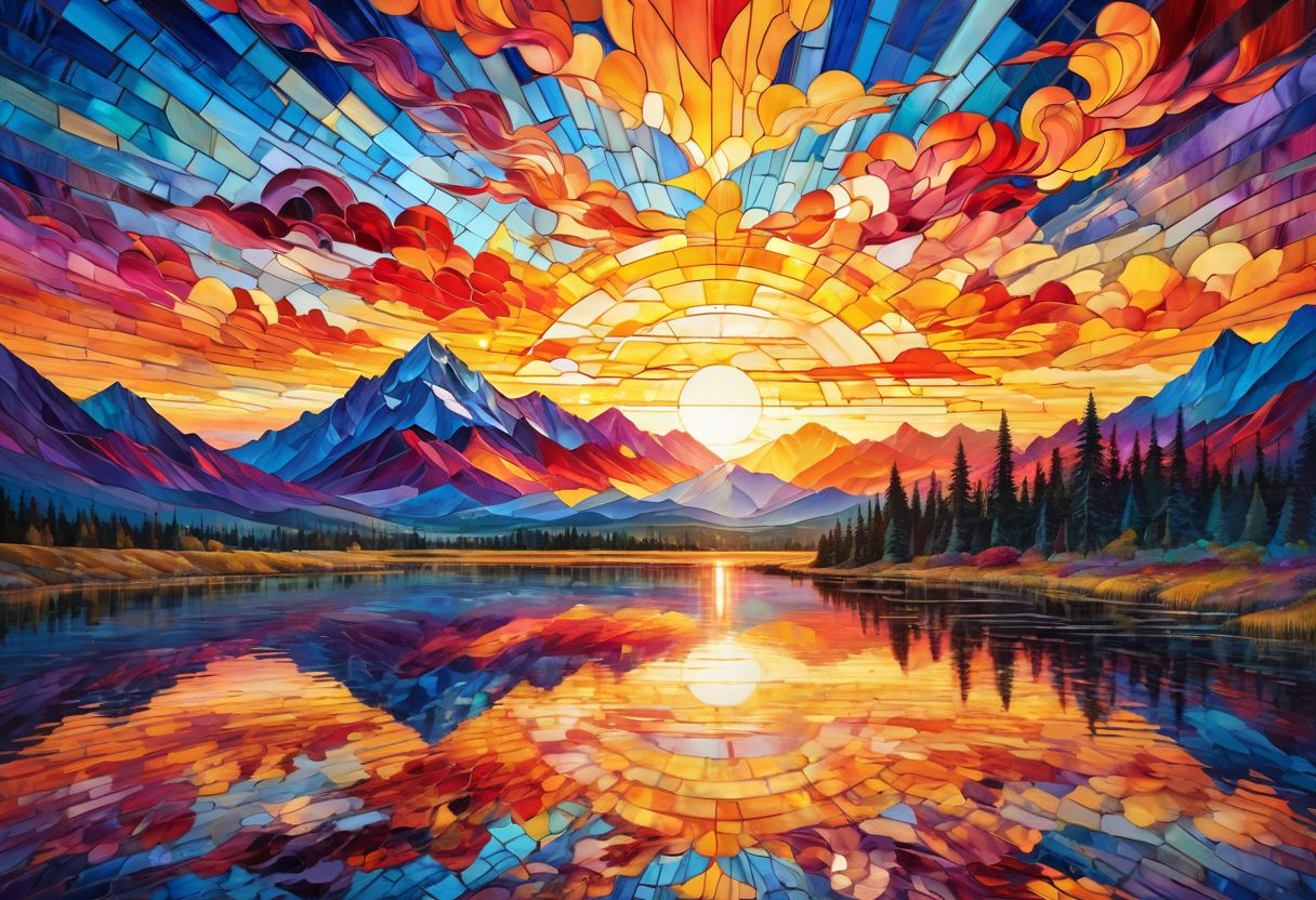 Sunset painting with double exposure, Vibrant and luminous composition, intricate and colorful style, stained glass art, mesmerizing and ethereal, intricate patterns, radiant hues, visual feast for the eyes, divine beauty and spirituality, transcendence and contemplation, play of light and color, sense of wonder and awe.