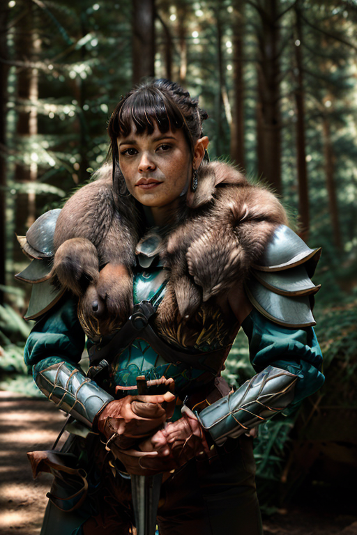 a Realistic portrait of a evandra woman with brown eyes , looking at the viewer, detailed face, detailed eyes, modelshoot style, wearing armor and a fur collar, holding a sword, soft lighting, professional Photography, Photorealistic, detailed, outdoors forest background, running, RAW, analog, sharp focus, 8k, HD, DSLR, high quality, Fujifilm XT3, film grain, award winning, masterpiece <lora:evandra v1.1:1>