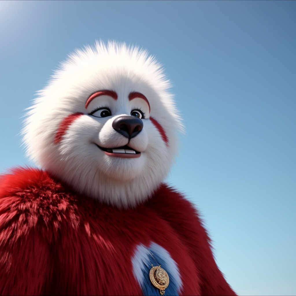 generate a realistic picture of bozo the fur MAscot - pristine white whf fur standing tall, 8k realistic cinema