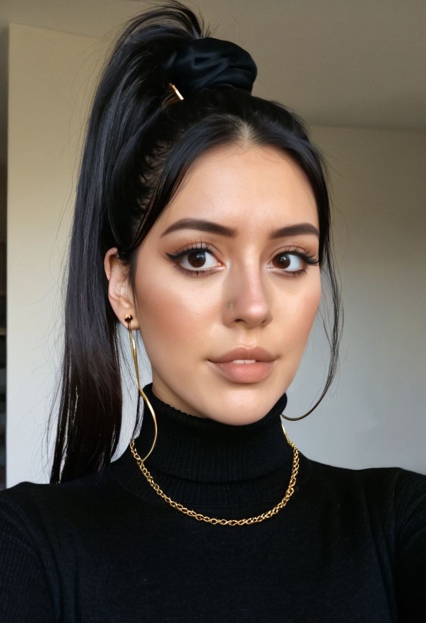 a woman with long hair wearing a black turtle neck sweater, black hair in a ponytail, wearing collar, wearing turtleneck, ponytails, selfie of a young woman, gold choker, necklace