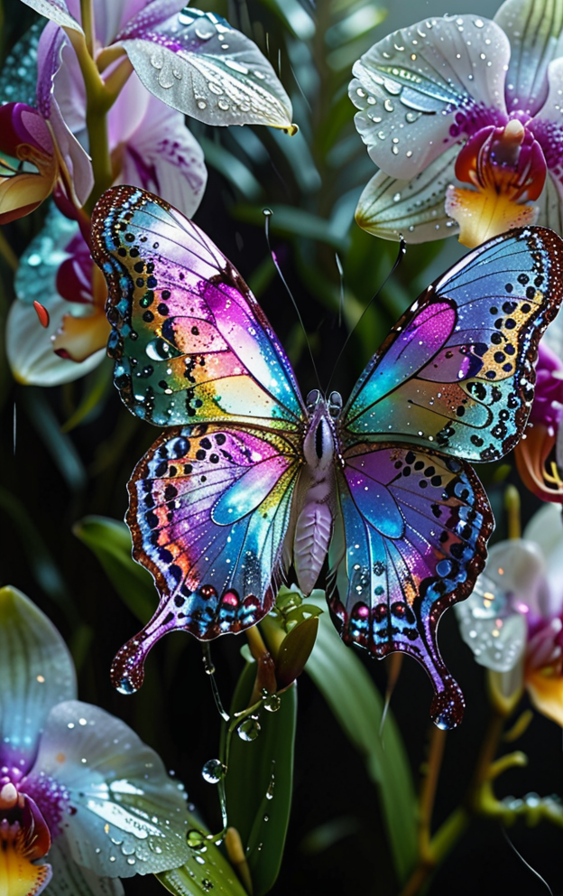 A iridescent butterfly with delicate wings featuring intricate patterns of Amazonian flowers, perched on a vibrant orchid, with a few dew drops glistening on its wings and a subtle shimmer effect <lora:MJ52:0.5>