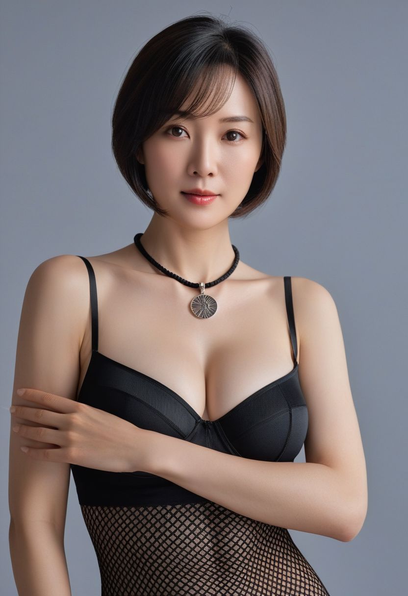 A beautiful (((49-year-old European woman))) with pale skin, perfect features, (perfect large breast, busty:1.1), and a sleek silhouette, standing on the rostrum with her legs spread wide on a sunny morning. She's a brunette with streaks of grey hair, short haircut, long oval face with a calm and friendly look, small thin lips, no makeup, wearing japanese black japanese dress (navel,black Fishnet pantyhose),(a thin pendant necklace, bracelets). photo-realistic, ultra sharp focus, symmetrical shot, (perfect composition), (rule of thirds composition), subject positioned off-center, highly detailed, intricate detailed, (((perfect body anatomy))), (-bad hands -unnatural hands -fused fingers -too many fingers), (matching eyes), proportional eyes, (-weird iris -weird pupils), (realistic skin), (-cropped head), (((wide shot, natural lighting, cinematic))), 4K,, trending on artstation, taken with 30MP DSLR with Carl Zeiss lens, award winning photography, best quality, masterpiece