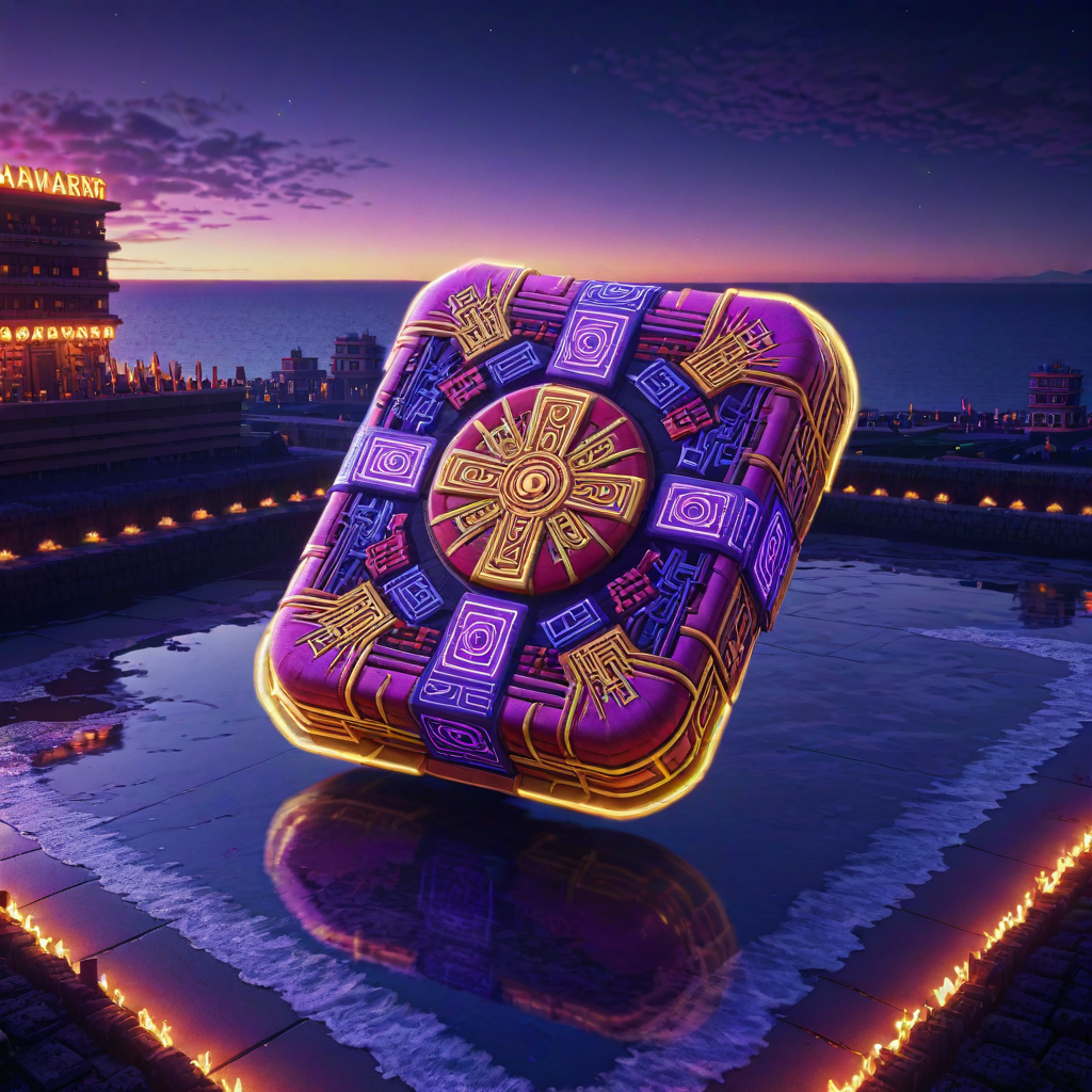 anime key visual, intricate background, Portrait of a Dullcore Abstract Aztec (crackers:1.3) , it is in a Final Fantasy setting, it is with Creative embroidery, plain Mecha-background, desolate city and beach, at Blue hour, Panorama, Amusing, Minecraft, Reflected light, F/14, Amaranth and deep red neon hue, Mauve background, rpg concept art, award winning, octane engine