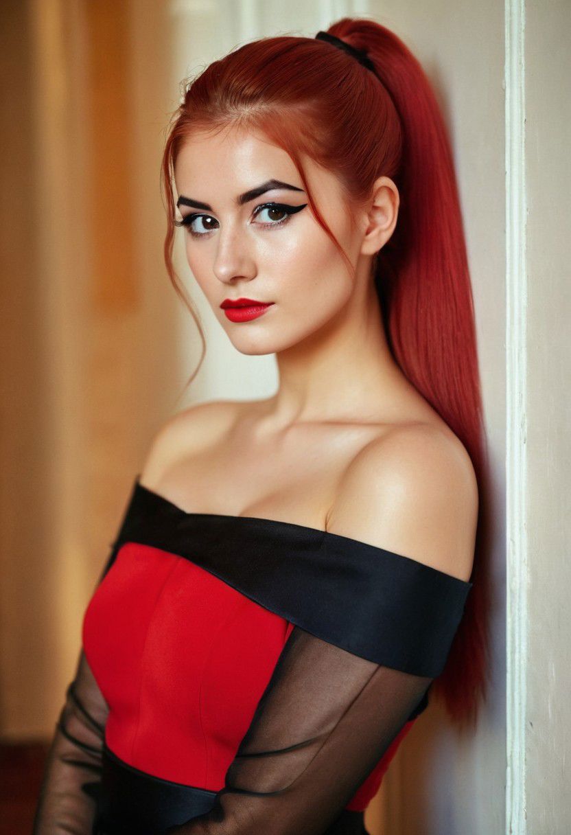 (Soft Lighting Photography by Mimoza Veliu and Mario Giacomelli:1.2), portrait, upper body, cute female, beautiful, 25 years old, (black bold eyeliner, makeup:1.3), soft grin, red ponytail hair, transparent dress, cleavage, kneeling, casual room, realistic soft skin, looking away from viewer, shy smile