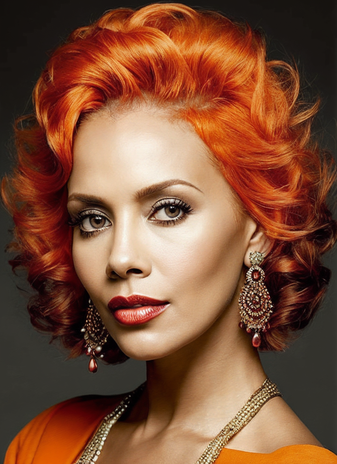 portrait of sks woman by Flora Borsi, style by Flora Borsi, bold, bright colours, orange Mohawk haircut, ((Flora Borsi)), <lora:locon_vivicafox_v1_from_v1_64_32:1>