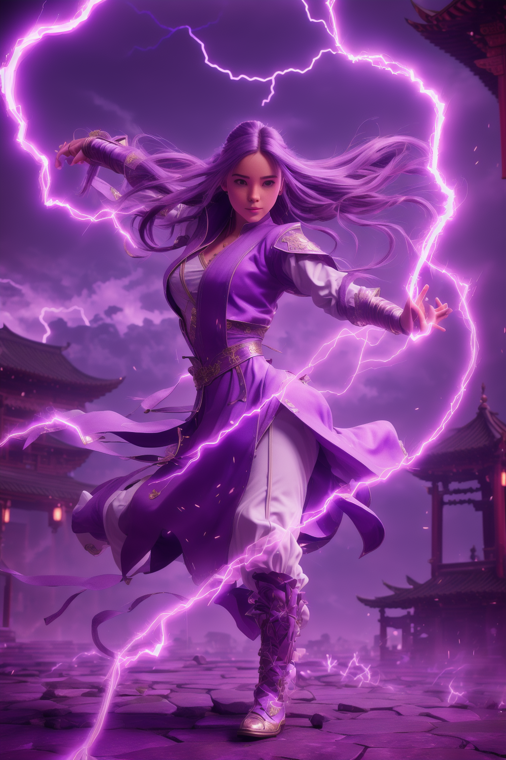 purple-lightning-aura,using purple-lightning-magic,purple-lightning-magic,ancient-costume,dancing,fighting stance,1girl,solo,long hair,brown hair,<lora:magic_fighting_purple_512_15:0.8>,