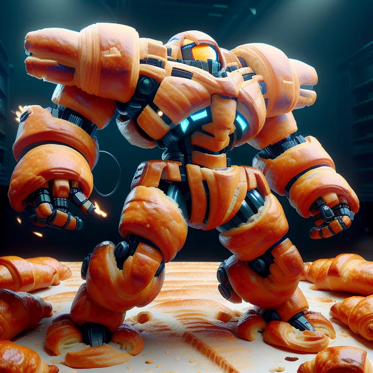 A combat robot whose entire body is made of croissants ,<lora:food_carving_sd_1_5_20231205:1>,