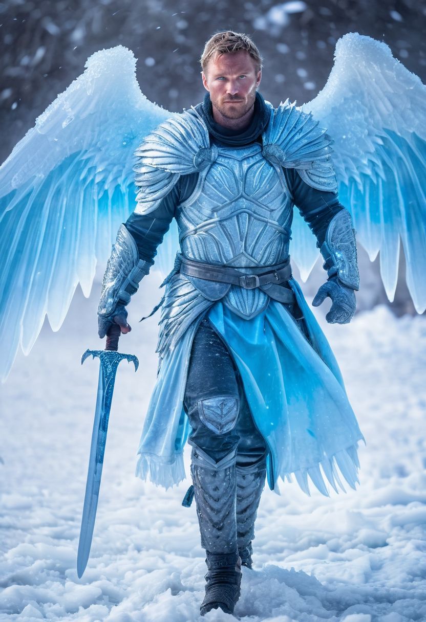 photo of 35 y.o handsome Scandinavian man, short hair, full body, mask of translucent ice covering half of his face, detailed face, icy blue eyes, wings of ice, holding large sword of ice, dynamic pose, clothes of ice, looking at viewer, ice armor, snow blizzard surrounding him, high quality, sharp focus, cinematic shot, dramatic lighting