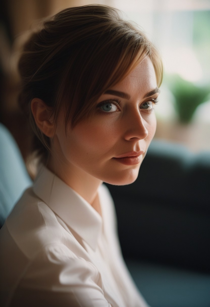 Raw photo, amazing realism, photo, intricate details, cinematic, score_9, score_8_up, score_7_up, score_6_up, beautiful womand, cute face, shy, kinky smile, extreme ultra detailed perfect eyes, blue eyes , 35yo, nose blush, working office woman, sitting in a couch, (head tilted) ,(holds her head with her arm), eyes contact, lot of desire for the viewer, side portrait , face focus , pov , indoor, inside home, in living room,, rimlight, professionally color graded, zeiss 150mm f2.8 medium format film analog