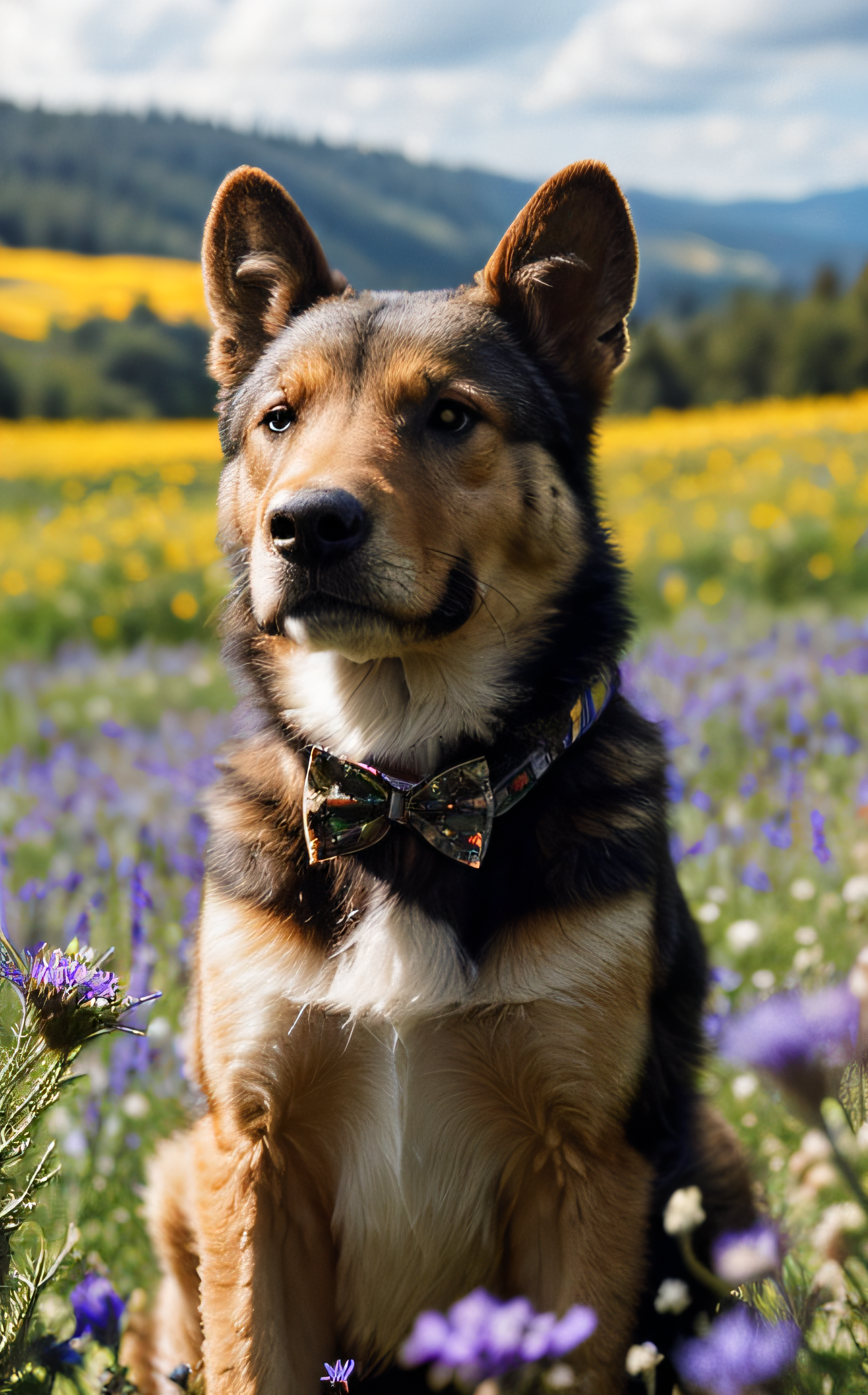 cinematic film still (top-quality, 8K, masterpiece:1.3) A photo of an enormous, playful bumblebee, buzzing around a field of colorful wildflowers, wearing a tiny bow tie, against a backdrop of rolling hills taken with a macro lens highly detailed, detailed skin, dappled sunlight <lora:epi_noiseoffset2:1> . shallow depth of field, vignette, highly detailed, high budget, bokeh, cinemascope, moody, epic, gorgeous, film grain, grainy
