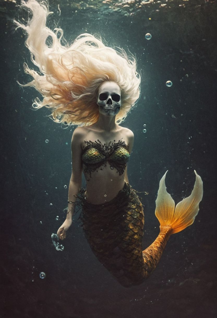 assassinkahb style, a realistic vibrant colorful photo of an mermaid wearing a T-Shirt, solo, Skull, simple background, 1girl, detailed background, upper body, female focus, long hair in wind, underwater, bubbles, white hair, bleaked colors, translucent dark-amber fin tail, atmospheric haze, Film grain, very detailed, simple, Gradient,, atmospheric haze, Film grain, cinematic film still, shallow depth of field, highly detailed, high budget, cinemascope, moody, epic, OverallDetail, 2000s vintage RAW photo, photorealistic, candid camera, color graded cinematic, eye catchlights, atmospheric lighting, imperfections, natural, shallow dof