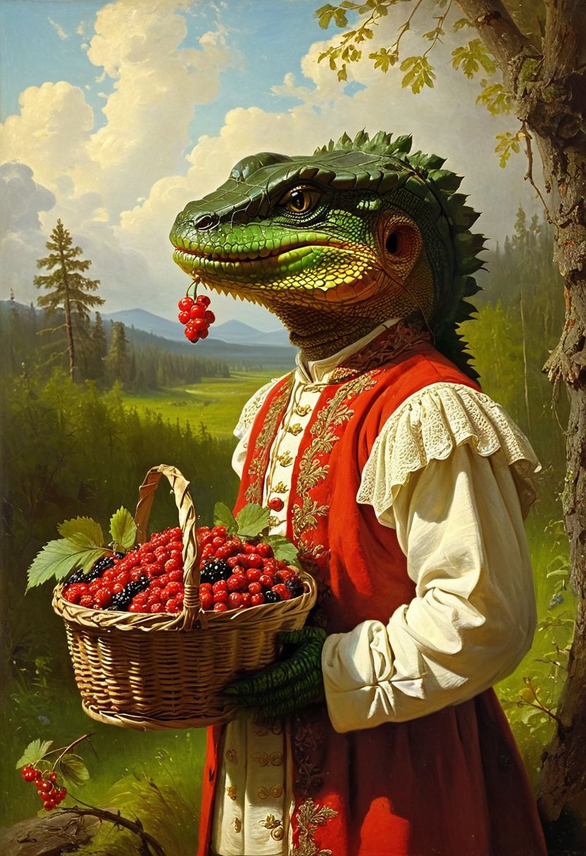 A lizardman holds a basket of berries in its mouth, from side, traditional russian clothing, long-range plan, oil on canvas, by Ivan Shishkin, <lora:ClassipeintXL1.9:0.2>, ,best quality, high resolution, extreme detail, outstanding composition, masterpiece,