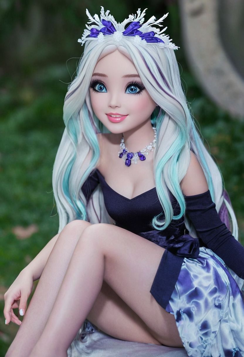 Expressiveh, (Masterpiece, best quality:1.8), score_9, score_9_up, solo, , soft shading, strong lighting, (anatomically correct), best high quality, high res, jewelry, cute, beautiful, (ultra realistic,32k, masterpiece:1.2),(high detailed skin:1.1),( high quality:1.1, (moody lighting:1.1), sexy, 1girl, crystalwinter, show accurate, ever after high, 30 years old, full body visible, seductive pose, jewelry, seductive look, smiling, face focus, long hair, hair ornament, wavy hair, messy hair, breasts, white hair, wavy hair, very long hair with multicolored highlights, (white purple cyan streaks),, black tanktop, straps, cleavage, sleeveless, black shorts, feet visible, black pantyhose, pantyhose, barefeet, irl, realistic style, sitting, park background, NSFW, BadDream, irl, photorealistic, uncanny valley