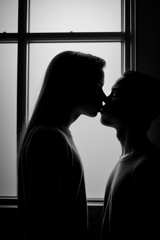 Black and white image, monochrome. Side view. Open shot. man and woman, fucking, against the wall, silhouettes shadowed by the contrast of light and dark. The only source of illumination is a beam of light through a large window in the background. realistic, HD, noir film