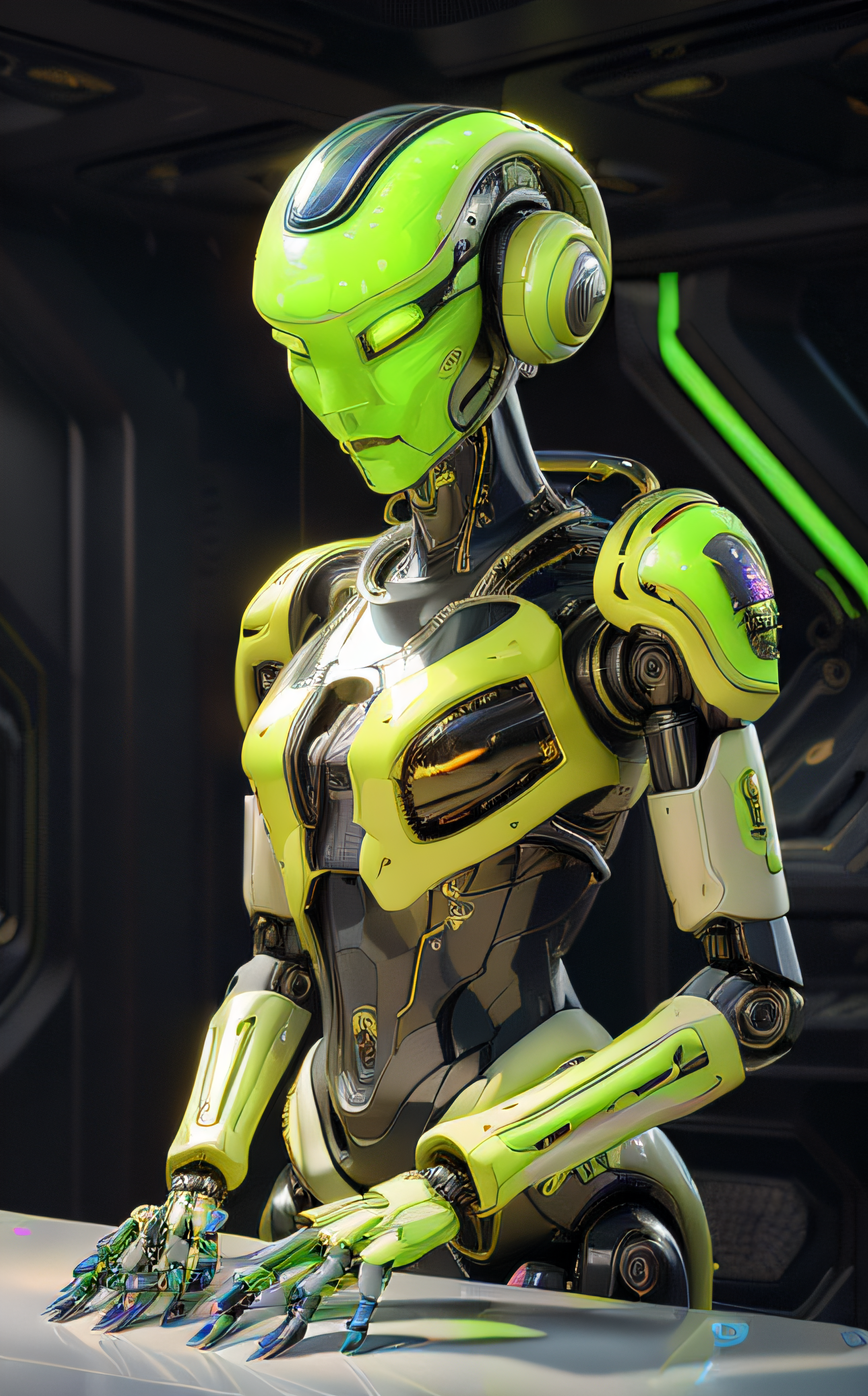 Alien-themed ((bright neon colors)), (top-quality, 8K, masterpiece:1.3) A photo of a sleek, humanoid robot, playing a musical instrument, wearing a stylish jacket, on a modern stage taken with a prime lens highly detailed, detailed skin, dramatic spotlighting <lora:IvoryGoldAIv2:1> ivory gold . Extraterrestrial, cosmic, otherworldly, mysterious, sci-fi, highly detailed