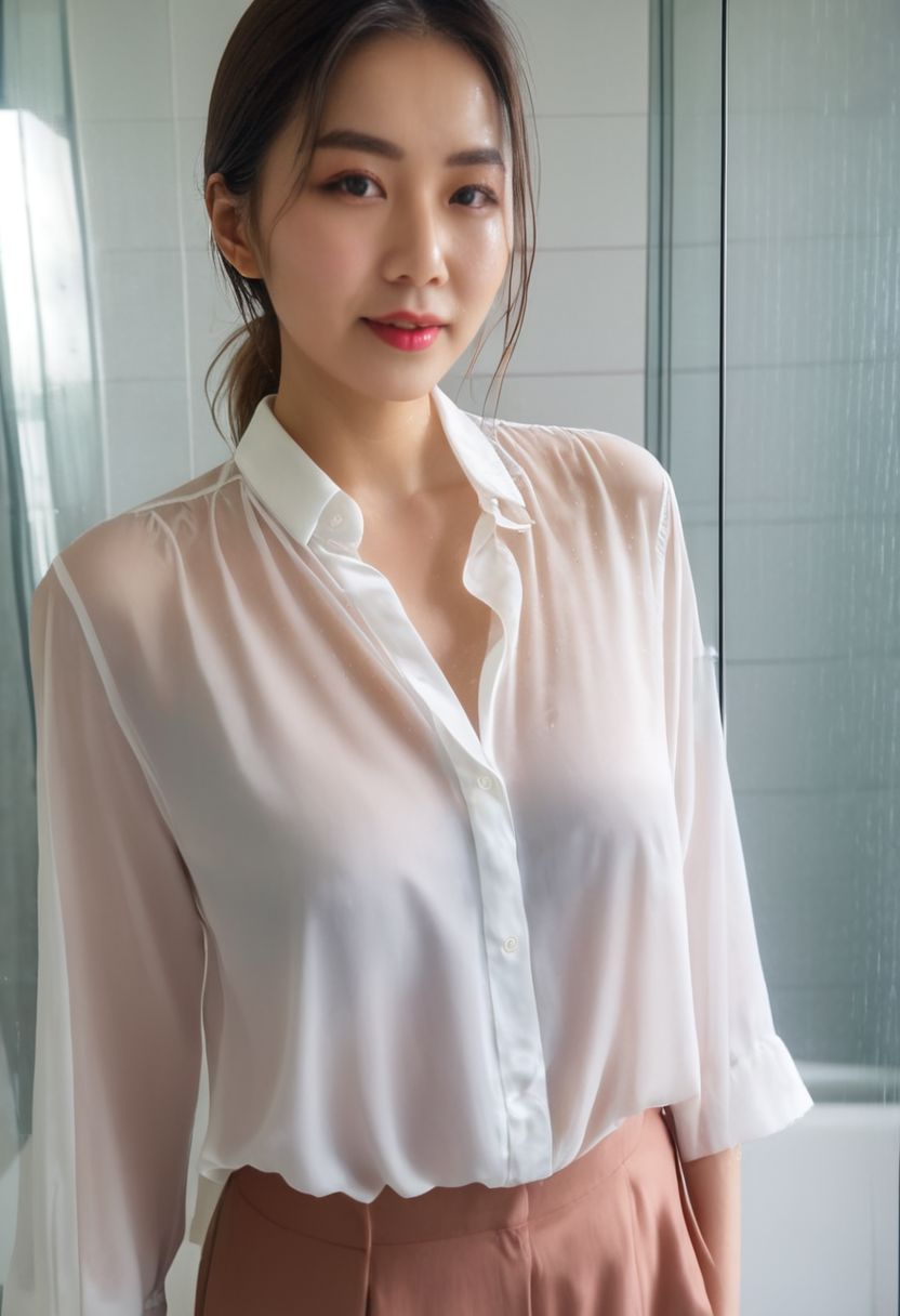 NSFW, Mirror selfie , slight smile , detailed skin face and eyes , showering, natural lighting , at home , see through loose wet blouse, cleavage, film grain, low contrast, natural face, sexy, nipples visible under blouse, water,