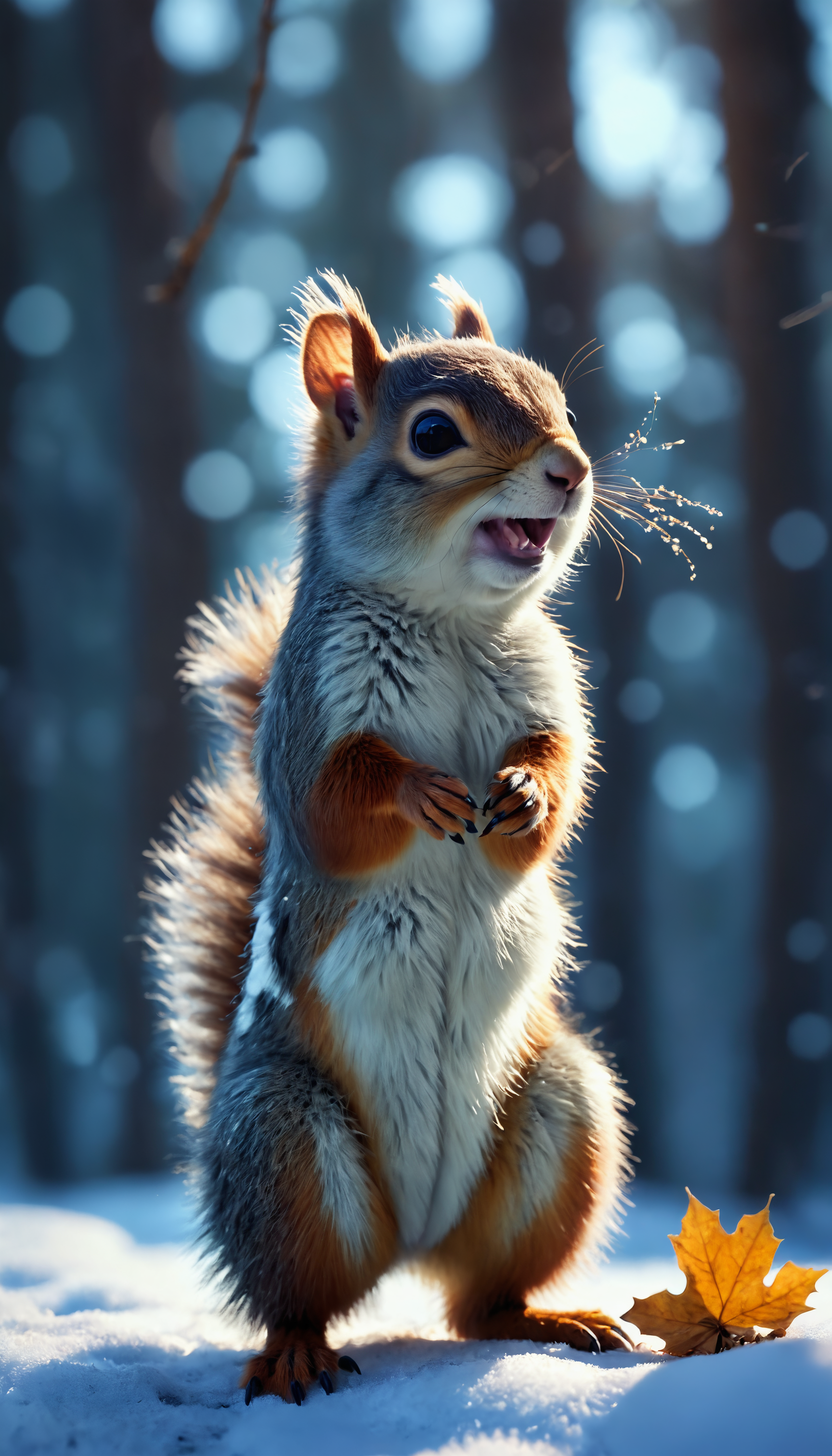 The image is a backlight 3D rendering of a small squirrel sitting is a snowy landscape in a forest and eating a walnut. It has a bushy tail and bushy ears. Its eyes are large and round, and its mouth is slightly open, as if it is about to say something. Its fur is grey and its tail is curled around its body.