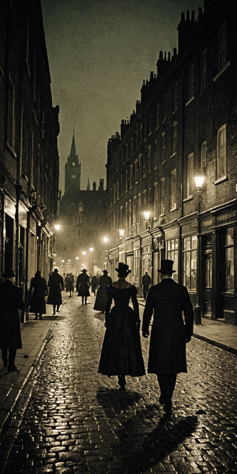 (gothic horror at night,faded and vintage photo,grainy and stained:1.2), a streetwith a few people in victorian era london, (sinister landscape at night,faded and vintage photo,grainy and stained:1.2)