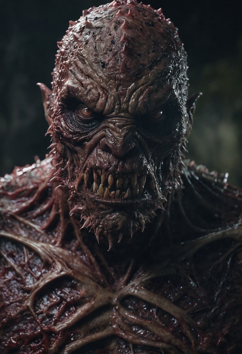 Hyperrealistic horror art imaginative, bleak,vibrant immersive, killer monster,Hyperrealistic art cinematic film still photography in the style of detailed hyperrealism photoshoot . Extremely high-resolution details,photographic,realism, human flesh, fine texture,incredibly lifelike, horror, full body pose