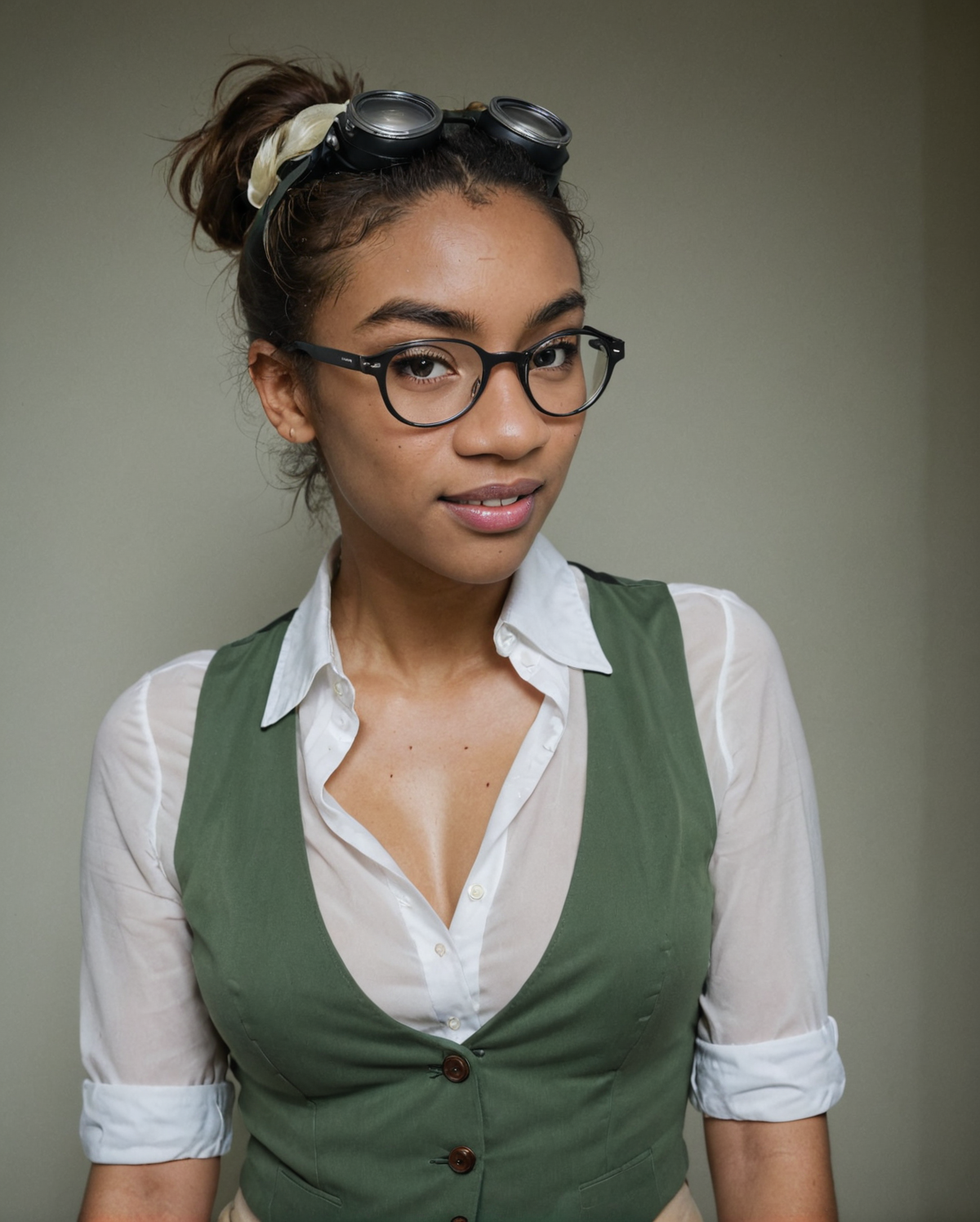 Sony Alpha A7 III (2018), soft fill lighting, (photo of a woman), leaning forward, happy, extremely large breasts, BREAK (Amber Layered bangs), ((Cream Bubble ponytail), pier, (Spring Green clockwork-inspired waistcoat, top hat, and goggles),), (distracted, looking for friends:1.4) <lora:Nora_XL-000009:1>