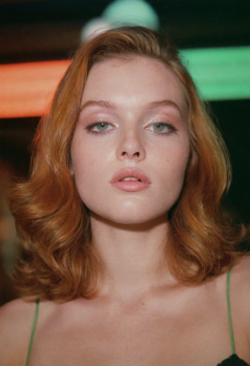 analog film photo ((EuroBabe, 80sPortrait)), ginger, green eyes, makeup, neon lights, (film grain:1.5) . faded film, desaturated, 35mm photo, grainy, vignette, vintage, Kodachrome, Lomography, stained, highly detailed, found footage