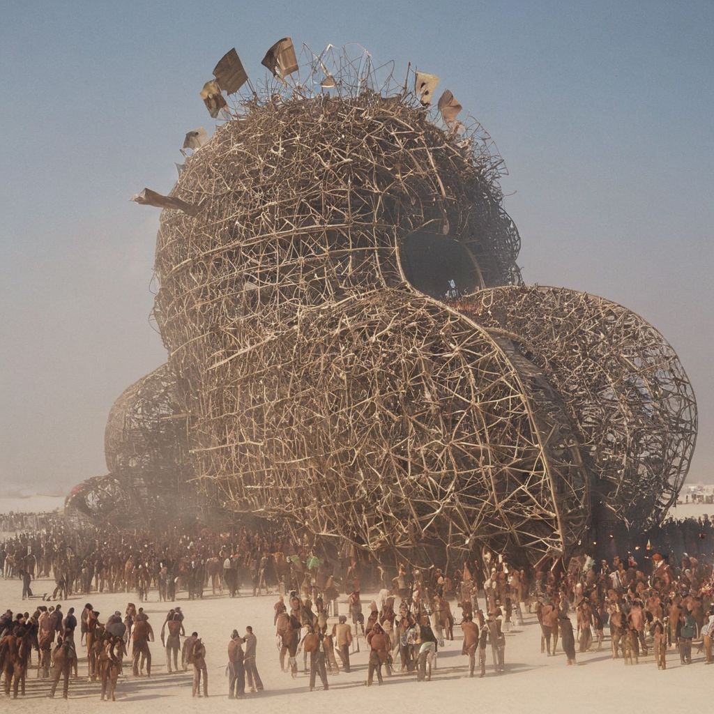 burning man festival rituals depicting huge mobs with flamboyant pilgrims clothing contemplating the huge fire of the enormous main sculpture