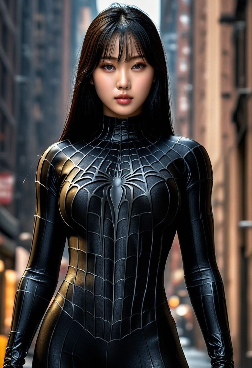 score_9, score_8_up, score_7_up, best quality, realistic, masterpiece, beautiful detail, hyperrealistic, woman ((1girl, woman body, big breasts)), amazing detailed full body portrait of a beautiful ulzzang girl, wearing a realistic and highly detailed black raimi spider-man suit, ((huge muscular girl)), professional model wears ultra - detailed black raimi spider - man suit, ultra - detailed and grained black raimi spiderman suit, suit covered entire body and hand, black spiderman gloves, wet, (standing ellegant), (full body), (dirty skin), close up, octane render, highly detailed, volumetric, dramatic lighting, (highest quality:1.1), (HDR:1.3), (top quality, best quality), realistic, high definition,