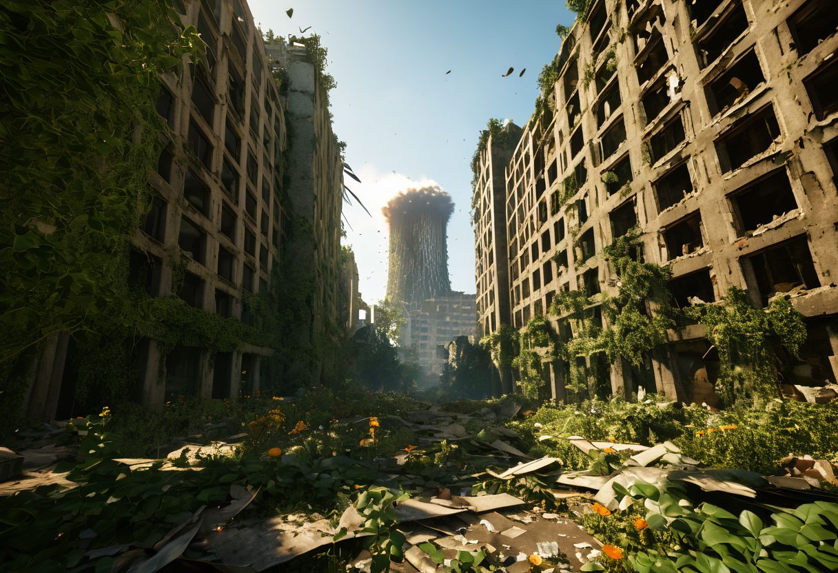 Masterpiece, tack sharp, hyperrealism, no blur, 8 k, highres, high resolution, superior quality, extremely highly detailed and intricate, Realism: The photograph captures a realistic image with a high degree of detail. Nature and Documentary, hyper real photo, through a shattered street that is between the shattered buildings that is winding snake-like through the heavy overgrowth and tall wild trees that are blowing wildly in the wind through the dirty crumbling destroyed overgrown ruins of Century City, award winning, trending on artstation, early morning sun shining through the shattered ruins of dirty towering skyscrapers buried beneath tall wild trees, seen from ground level from a shattered window in a dirty skyscraper on the far away looking between the towering ruins of skyscrapers on both sides with broken windows and ivy growing and wild flowers, ruins broken, dirty crumbling destroyed overgrown ruins in the early morning, extremely detailed, every building is dirty and broken and toppled into the streets, rubble, in the far background a nuclear mushroom cloud with smoke and fire is rising into the sky