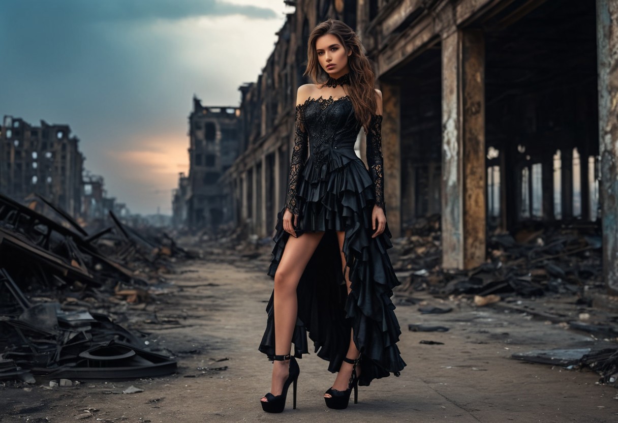 A cinematic photo of a stunning model in black with open shoes, luxury dress, in the style of multi-layered textures, ornate details, gothic core, highly detailed, photorealism, attractive, gorgeous beauty, as she stands dominantly and confidently in a desolate, dark post-apocalyptic cityscape, capturing the stark juxtaposition of beauty and decay, with the model's flawless skin glowing like a beacon of hope amidst the ravaged urban landscape. photographed with a focused depth of field to blur the bleak surroundings, emphasizing her striking, rebellious pose. full body, golden hour.