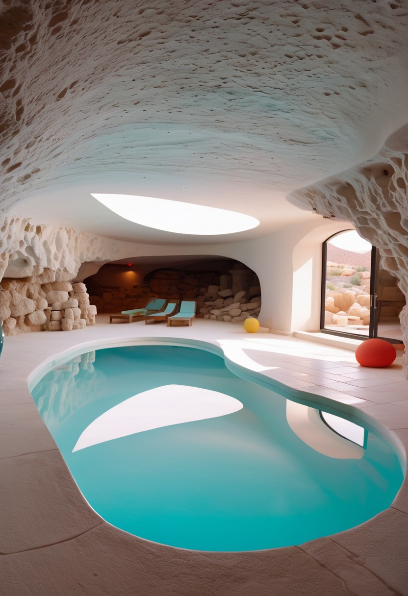 award winning interior photo, photograph, ultra photorealistic, photorealism, film still of inside a modern white spacious (swimming-pool inside a smooth stone cave:1.25), smooth shading, desert, daylight, bright colors, hyper realistic, modern, lights, minimalistic studio architecture, behance, halation, bloom, dramatic atmosphere, rule of thirds, 8k uhd, dslr, high quality, film grain, Fuji Superia X-TRA 400