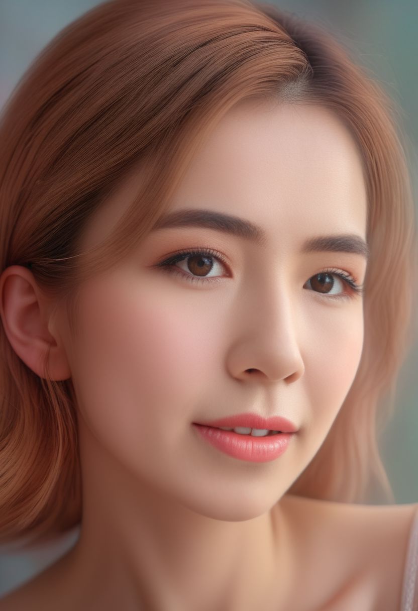Beautiful woman, ethereal, high detail, portrait, elegant, delicate features, emotional expression, masterpiece, 8k resolution, Extremely high-resolution details, realism pushed to extreme, fine texture, incredibly lifelike, looking at viewer, solo focus, realistic, photorealistic, ultra realistic photograph, pastel background with pastel bokeh, Exquisite details and textures, grainy, face details, real face, perfect body, smile, 1girl, brown hair,