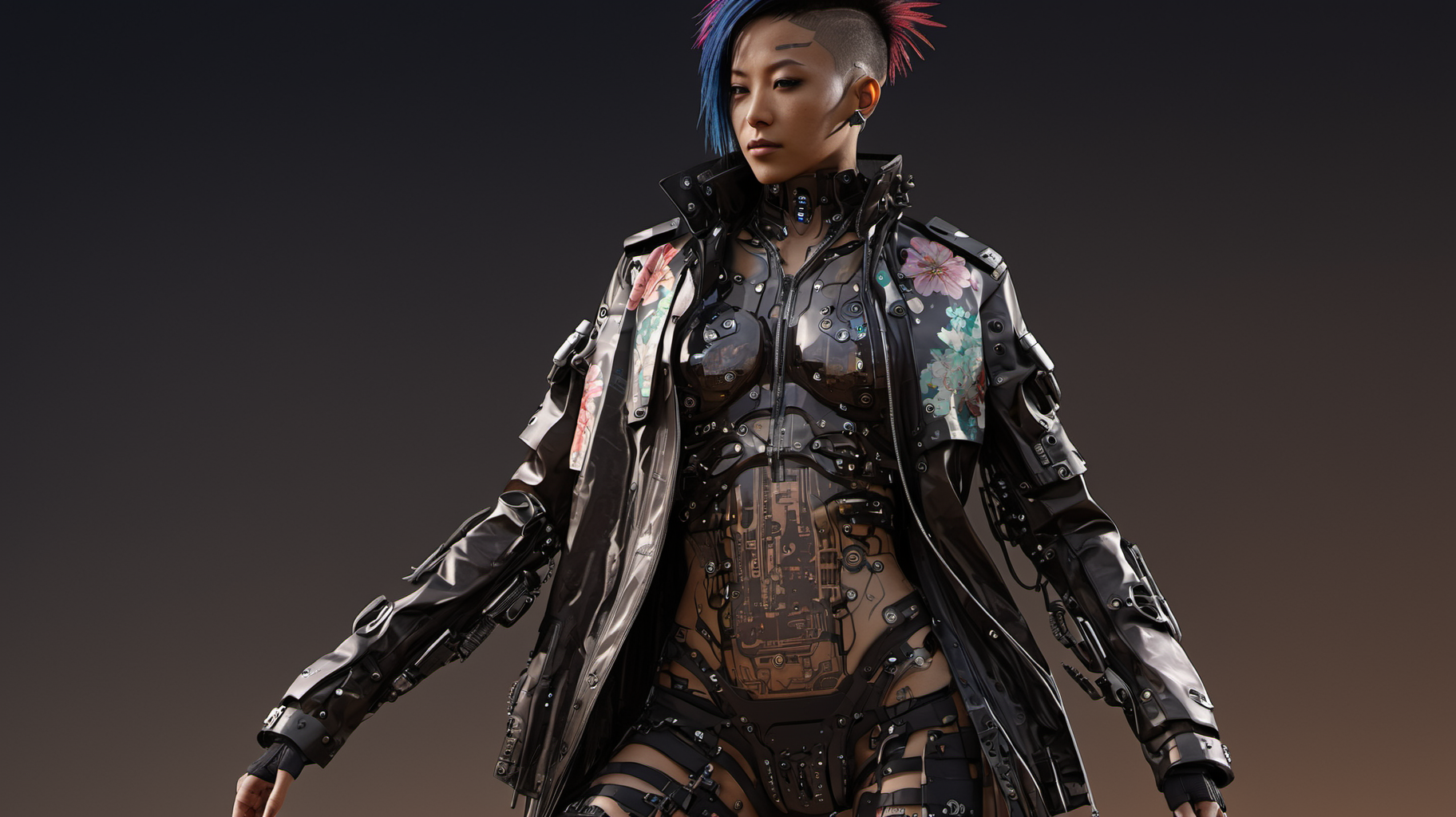 female cyborg, (wasteland punk:2.0), Biomechanical, urban punk techwear, circuits, sci-fi, schematic, dark fantasy, (Transparent Vinyl RGB jacket), full body portrait, niji style, (ukiyo-e:1.5), floral patterns, ((masterpiece)), (Ultra-HD), (high-resolution), (16k), (epic), (insanely detailed:1), (photorealistic:1), color-graded, anime style, concept art, drawing, edge lines, harsh shadows, high contrast, (dark shadows, warm colors, dark colors, high contrast)