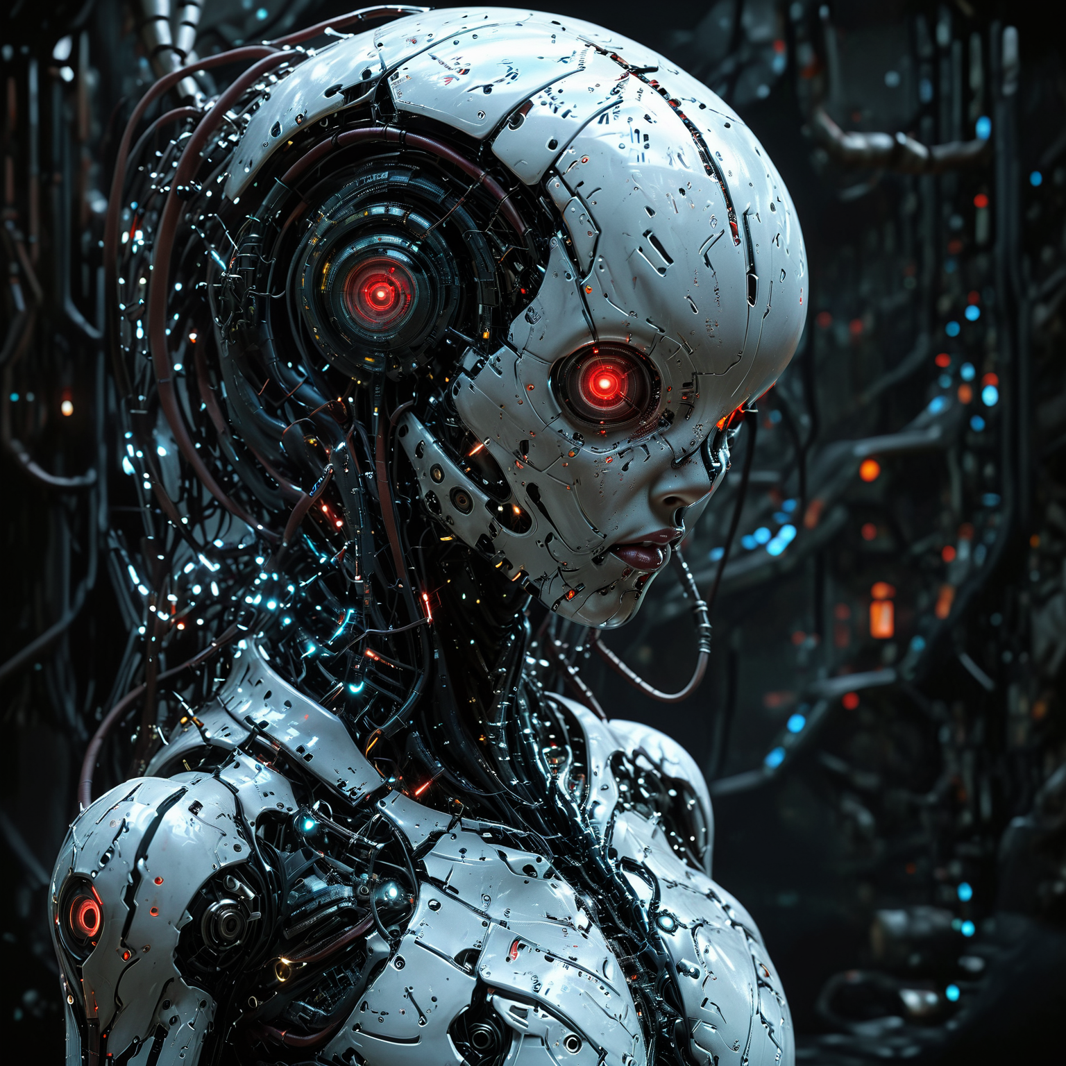 (biopunk sexy woman:1.2) with cybernetic features, cinematic, cyberpunk elements, amazing detailed, grim sci-fi, biomorph, organic and mechanical, natural light, beautiful cleavage, glowing red eyes <lora:Dark_Futuristic_Circuit_Boards:0.6> circuitboard, dark futuristic <lora:hyperkraximalism_v1-1:0.2> <lora:Faceless_Cyborgs:0.9> <lora:SDXLFaeTastic2400:0.6>