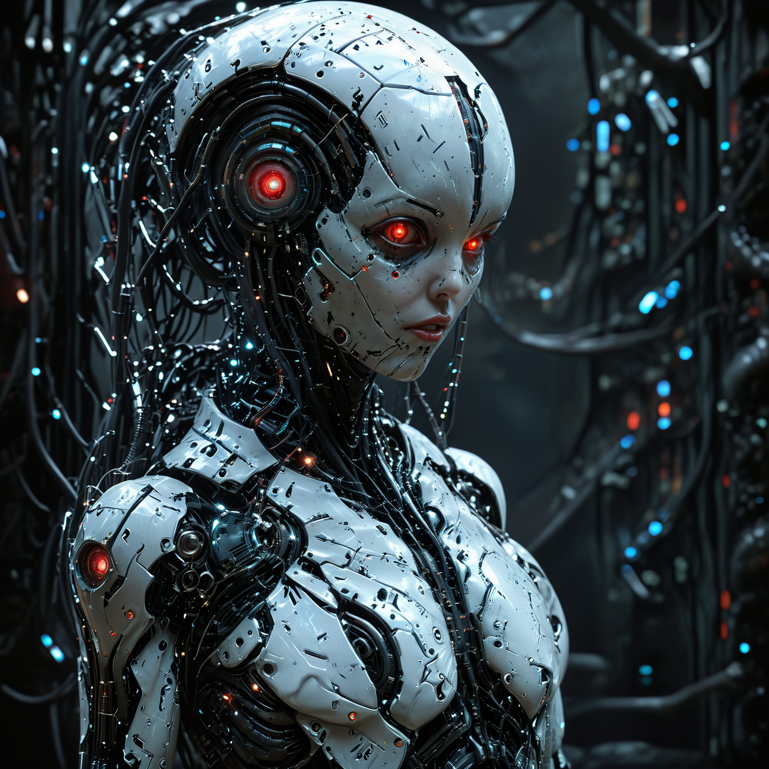 (biopunk sexy woman:1.2) with cybernetic features, cinematic, cyberpunk elements, amazing detailed, grim sci-fi, biomorph, organic and mechanical, natural light, beautiful cleavage, glowing red eyes <lora:Dark_Futuristic_Circuit_Boards:0.6> circuitboard, dark futuristic <lora:hyperkraximalism_v1-1:0.2> <lora:Faceless_Cyborgs:0.9> <lora:SDXLFaeTastic2400:0.6>