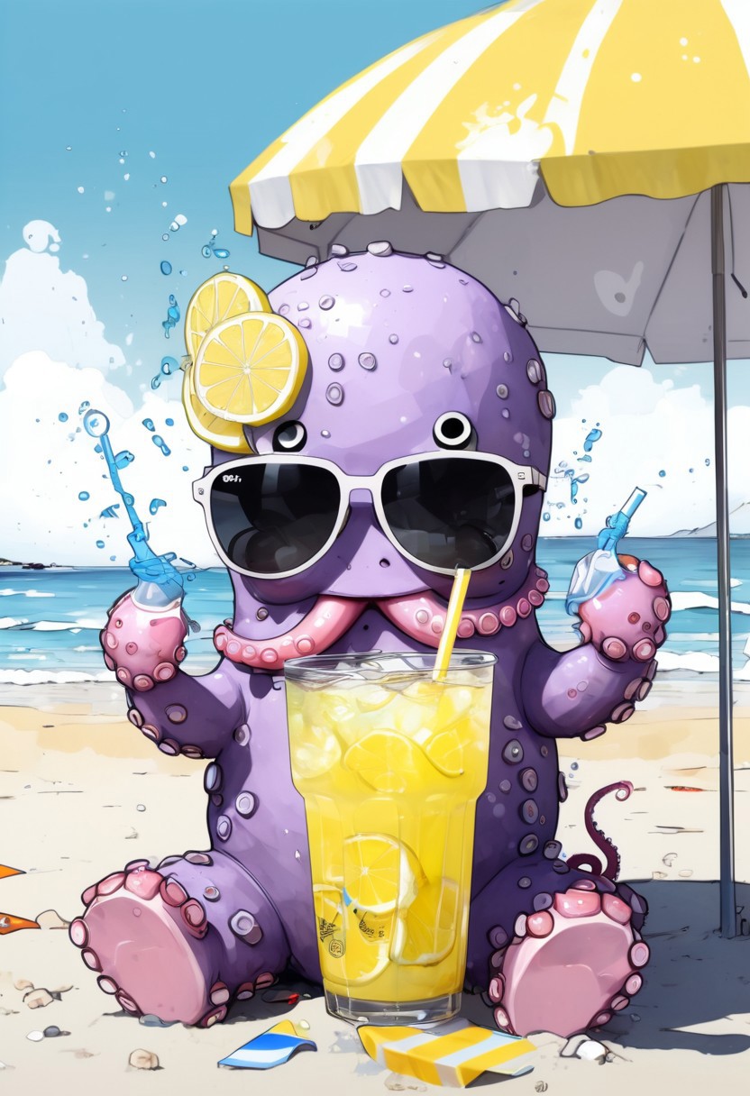 smiling kawaii sumikko octopus wearing sunglasses drinks lemonade at the beach, art by yoji shinkawa and sandra chevrier, trending on artstation, award-winning, perfect composition. Splash, animated, under beach umbrella,