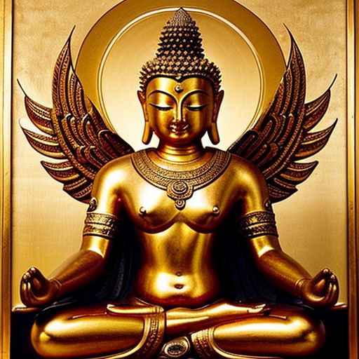 In an impressive image that merges elements of traditional Buddhist art with a contemporary comic book style, a majestic Buddhist deity is depicted with multiple arms and legs, surrounded by a golden aura symbolizing enlightenment and divine power. The central figure, possibly a monk or spiritual practitioner, is in a deep meditative pose, emanating serenity and concentration. Behind him, the grand deity appears to offer protection and wisdom, with a serene expression and an imposing presence that dominates the surrounding space. The intricate details and the use of golden hues enhance the divinity of the scene, transporting the viewer to a spiritual realm of peace and transcendence.
