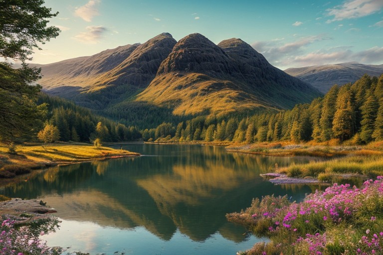 beautiful, ((masterpiece:1.4)), ((best quality:1.2)), intricate details, highland landscape, trees, flowers, crystal clear lake, highres, realistic,UHD, sharp focus, mesmerizing, ultra detailed, high texture resolution