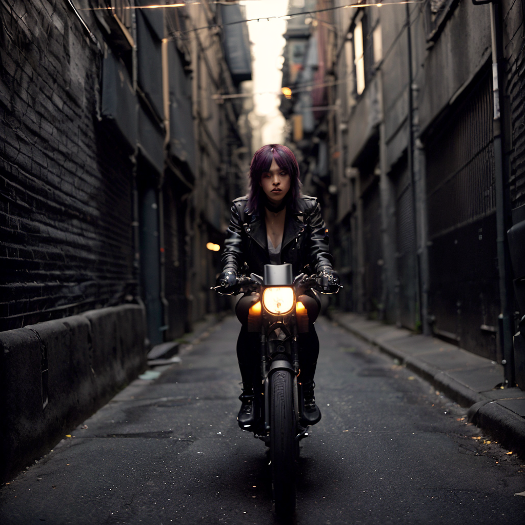 1girl, portrait, wolfcut, bangs, long layered hair, multicolored hair, (Wrapped in a sleek leather jacket, accentuated by silver studs and chains, emanating a fierce and edgy aura), (A dimly lit alleyway, with shadows lurking in the corners, exuding an atmosphere of calculated intensity: 1.3), (seductive:1.3),(analog, cinematic, film grain, hazy atmosphere, cinematic shot:1.3), <lora:concept_hairstyle_wolfCut_sd15_v1-wolfCut:0.8>