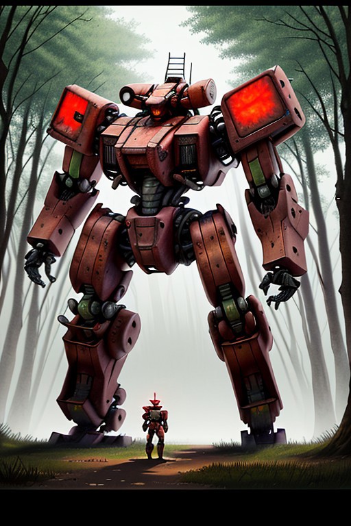 sunny day, forest on background, full view, red lights., mecha. detailed, very big mecha