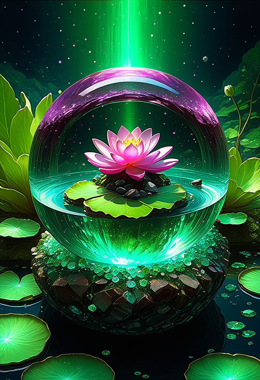 fluorescent horizon, color field painting, luminism, digital brush strokes, cg graphic illustration, Detailed image of a huge glass ball floating in outer space, the inside of which is like a hollow hot pink amethyst geode, completely filled with a garden inside, within which a bed of crystal flowers is sprouting, and from the far end flows a river of liquid sapphire, the geode cascading down to to the viewer and into space, with crystal red ruby lotuses floating on the water, and crystal green emerald frogs on water lilies, brown tiger's eye gemstone trees growing next to the river, with citrine crystal leaves pale starlight from the side, with glowing sparkling sparkles, very detailed trend on Pixiv fanbox, Studio Ghibli Genshin Impact, masterpiece, oil on canvas, Raphael, Caravaggio, Greg Rutkowski, Beeple, Beksinski, Giger