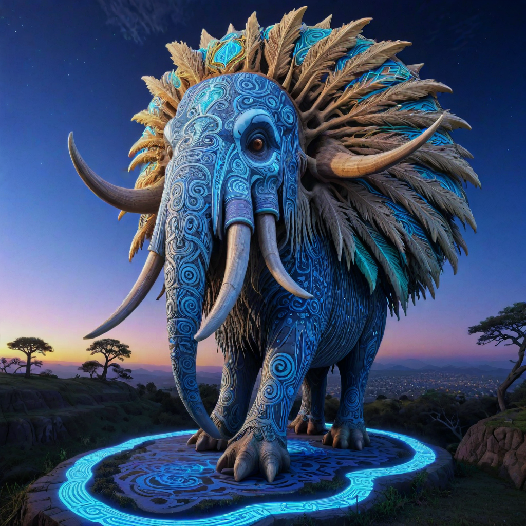 anime key visual, magnificent, majestic, angle from below of a Masterpiece Grotesque (Mammoth:1.3) with Colorless designs, detailed DayGlo blue background, Somali hillside with Baobab, at Sunset, Very wide view, Horror, Bombacore, flat lighting, Low shutter, Pastel Colors, intricate, Mandala, most beautiful artwork in the world, RTX