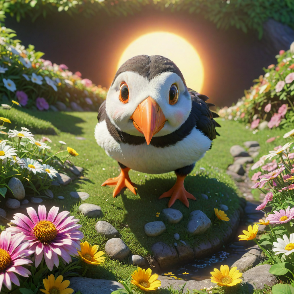 (designed by Johji Manabe:0.9) and (Leanne Surfleet:1.1) and (Takasaki Masaharu:1.2) , anime key visual, concept art, wide shot of a (Puffin:1.3) , it is very Radiant and Hateful, hyper detailed, garden and Daisies background, autumn roots with Carnation, at Sunrise, split diopter, Sketch, Frightening, Rococo, short lighting, 50mm, Offset print, Mandala, epic fantasy, Concept Art World, Pixabay