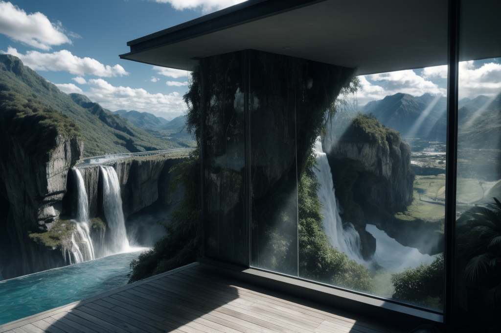 black modern villa into the montain, on the edge of a cliff surrounded by waterfalls, cloudy weather, intricated architecture, (view from upper front:1.3), black walls, photo from far away, (masterpiece),(high quality), best quality, real,(realistic), super detailed, (full detail),(4k),8k,pool, window, no humans, scenery,outdoors, mystic, bridge, intense sunlight, <lora:_20230805154543:1><lora:add_detail:1.0>