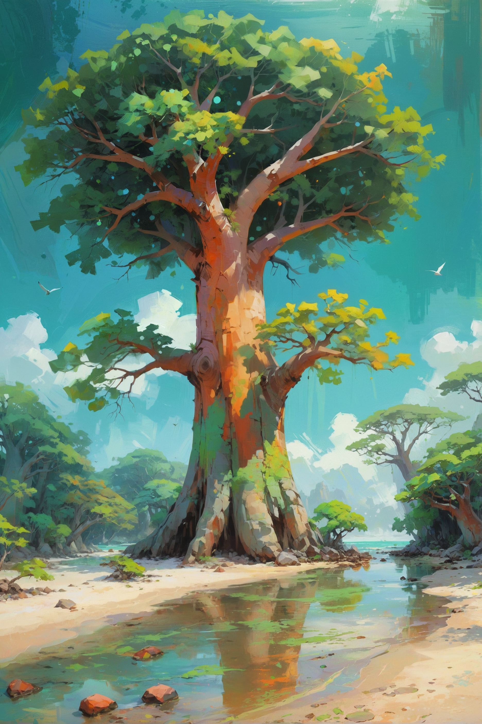 stylized by Krenz Cushart, lush beach with Baobab, landscape of a (Deciduous Forest:1.1) , it is Airy, Snowy, Neo-Dadaism Art, Hypersaturated, under water