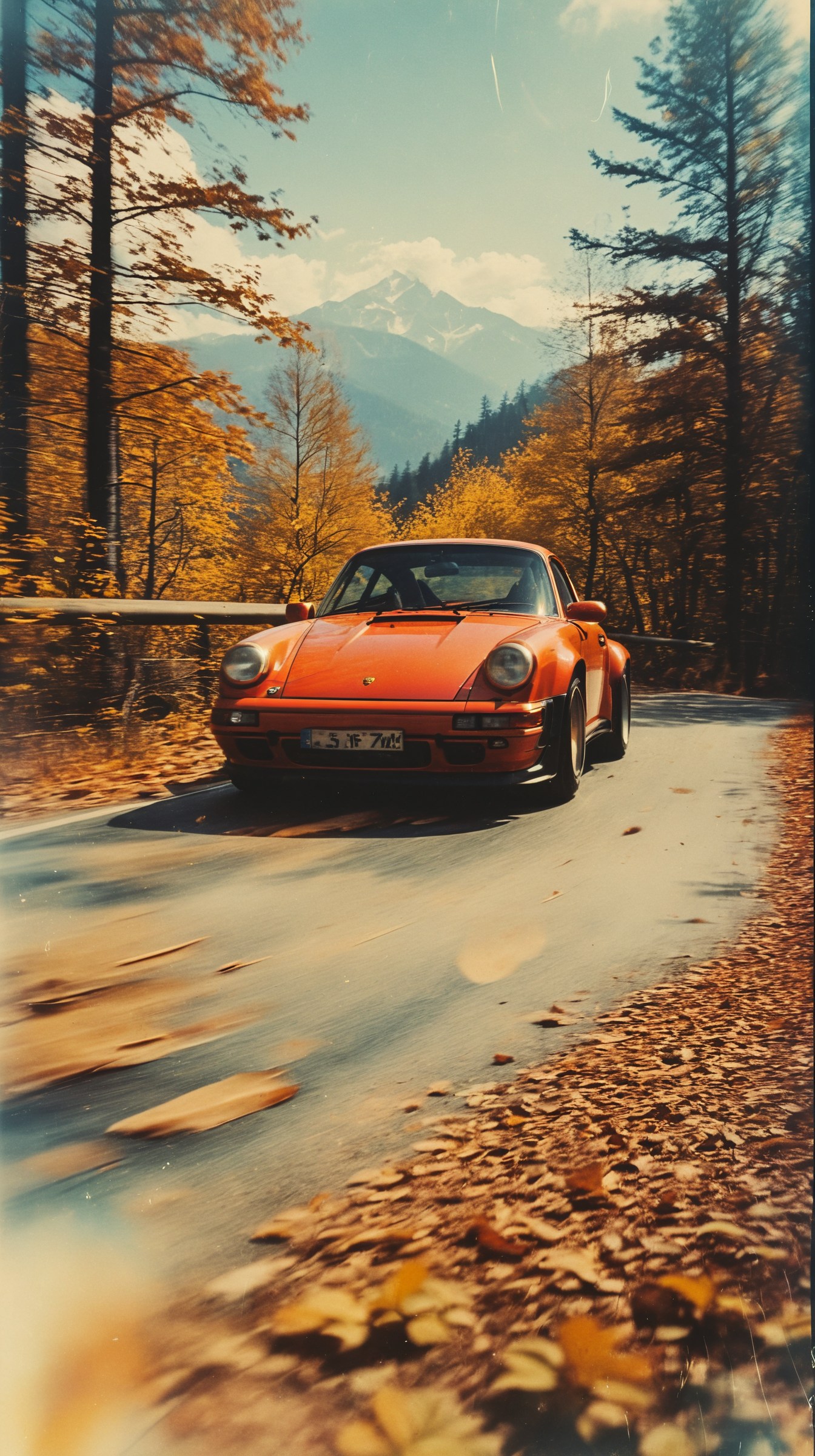 35mm Vintage photo of, front view of red porsche 911 turbo driving on a mountain roard, sunny day, blue sky, trees in vivid colors of indian summer like yellow orange red, lensflare, wet roard, reflections, motion blur, <lora:Vintage_Street_Photo:0.85>