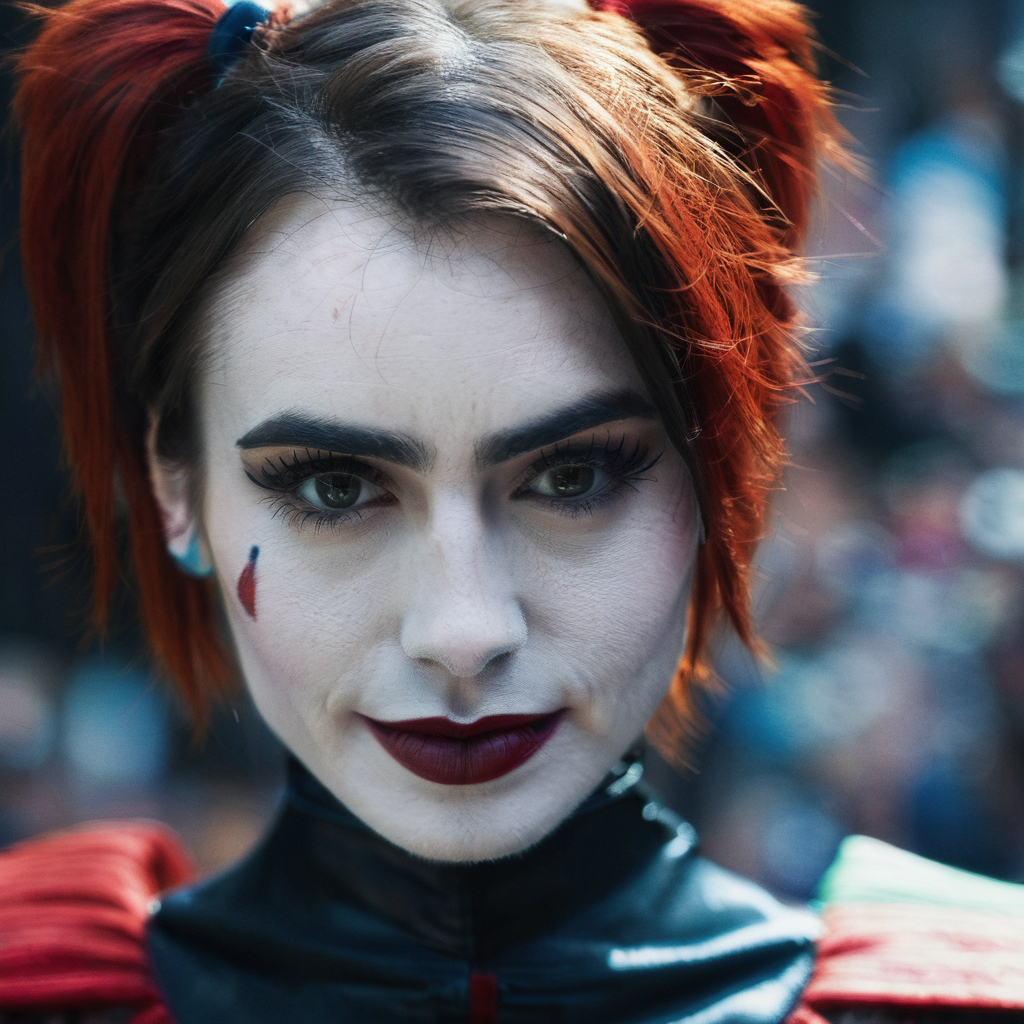 High res closeup portrait photo of an actress dressed as Harley Quinn, f /2.8, Canon, 85mm,cinematic, high quality, skin texture, looking at the camera, lixcollins, <lora:licollins_juggerX_xl_1_st_wocap-lixcollins-000130:1>