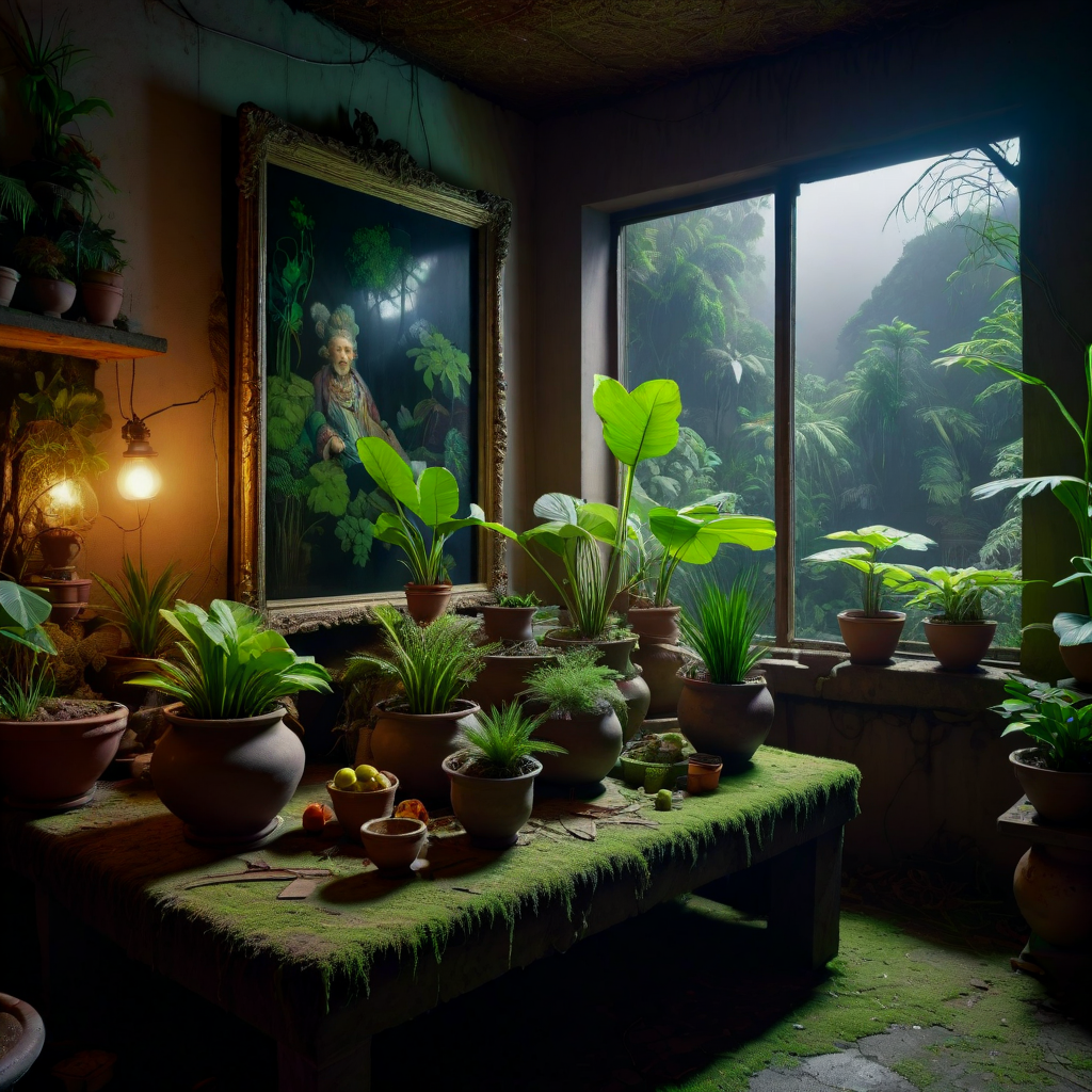 studio mundane, Atomicpunk, Rule of Thirds, landscape of a (Ciudad Perdida:1.3) from inside of a Geneva, it is very Hairy and Grotesque, lush beach with Pots with plants, Snowing, Illustration, Evil, Neon Light, telephoto lens, four colors, Elegant, glittering, trending on CGSociety, 64K, (romanticism art designed by Rembrandt van Rijn:1.3) , (Beatrix Potter:1.1) , (James Jean:1.1)