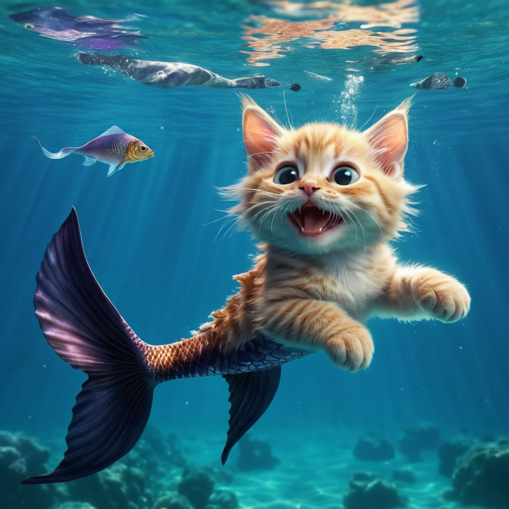 realistic, kitten as mermaid, swimming in the sea, smiling, half cat and half fish, fish tail