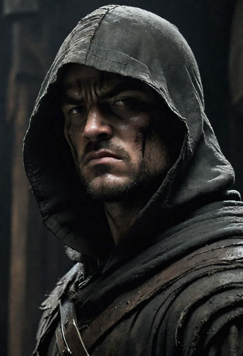 robin hood, strong build, dark cinematic, brooding feel, menacing quality, grim and eerie, side angle, style of Guy Denning
